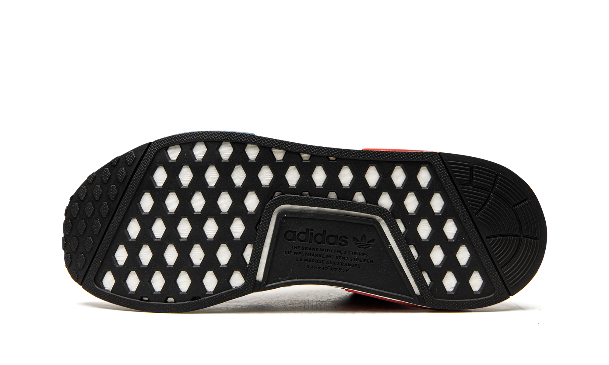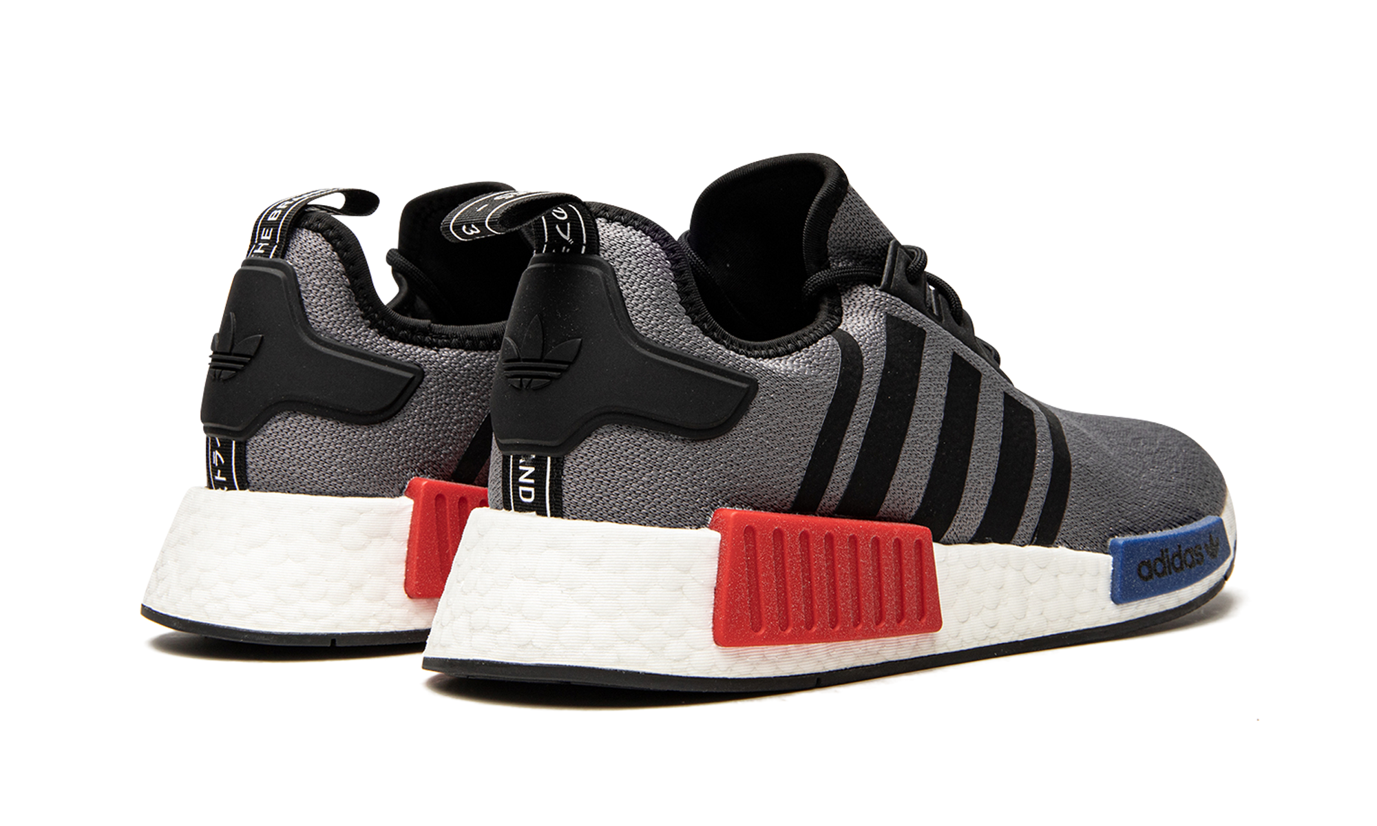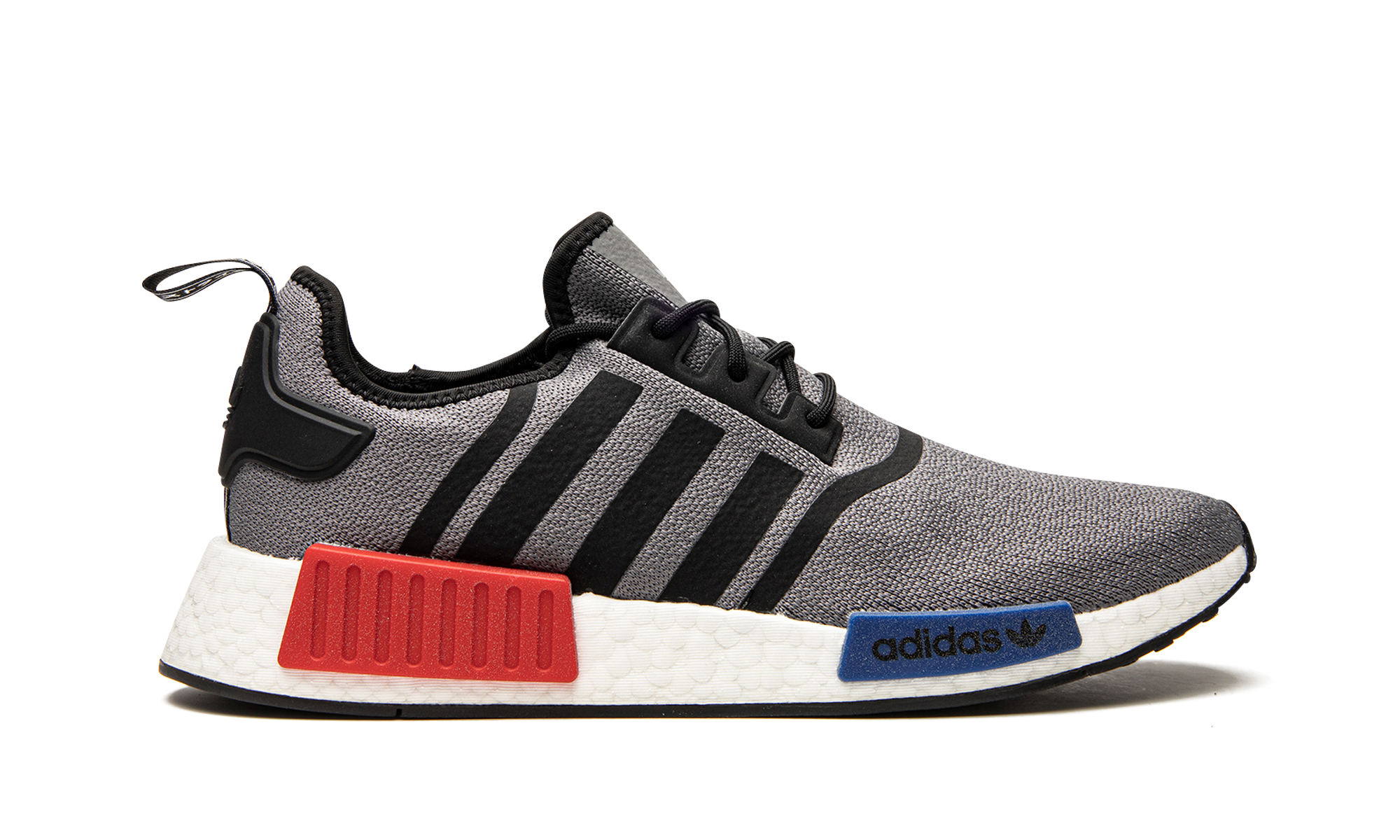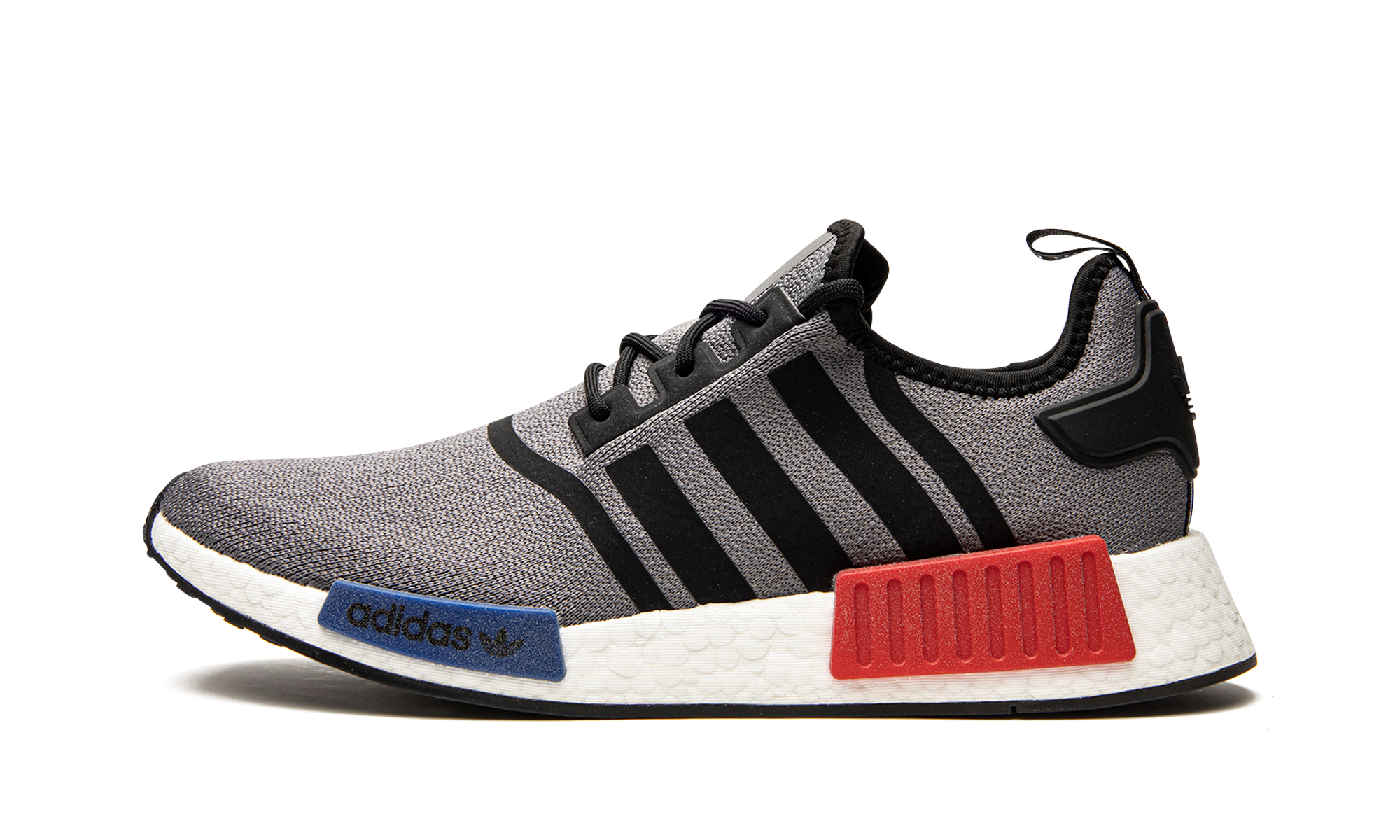 The adithtdas NMD_R1 "Grey OG" brings back the iconic red-and-blue midsole plug pairing of the original silhouette that launched in 2015. The lifestyle sneaker features clean lines with a grey Primeknit upper contrasted by black decals that highlight the toe box, Three Stripes on each side, collar, and heel tab. A stark white Boost foam midsole is paired with red and blue block-like bumpers and the style is finished with a black rubber outsole. Grey OG