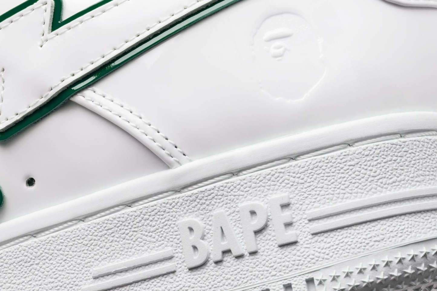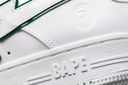 A sophisticated design with a classic silhouette. The entire upper is made up of white patent material, while bright red, green, and blue accent colors are featured on the insole, tongue, and STA outline.
