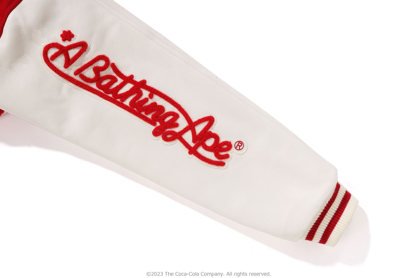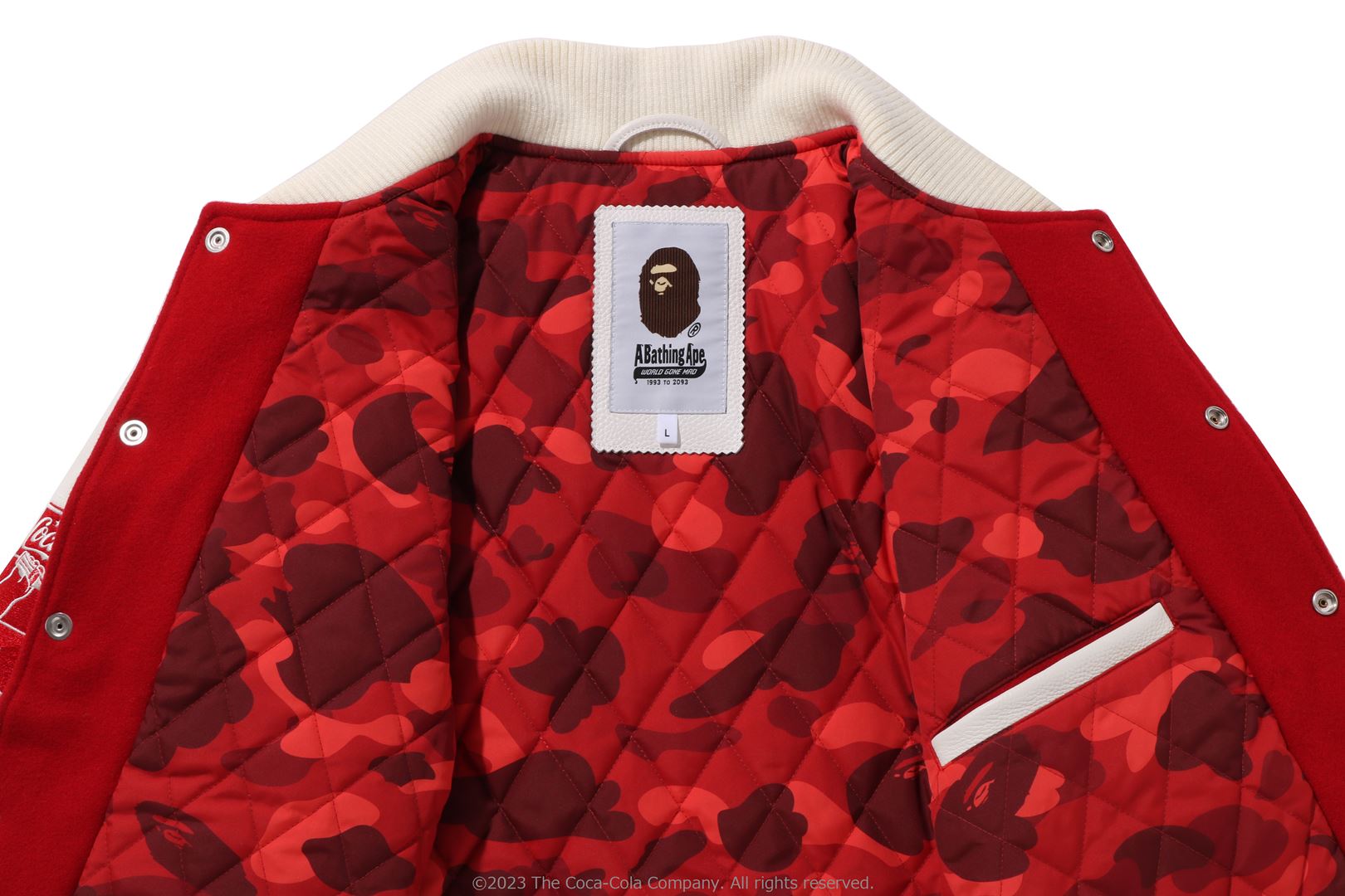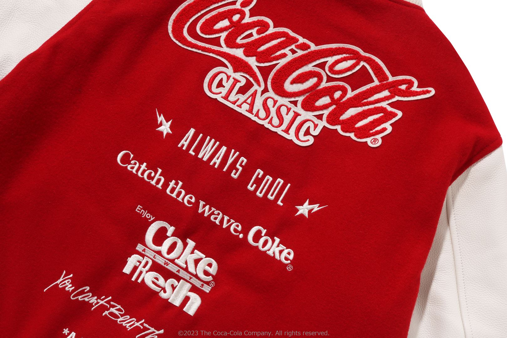 A varsity jacket with piece-dyed wool/nylon blend melton material on the body and cow leather on both arms. The lining is quilted with a COLOR CAMO pattern and padded. AthtPE HEAD Sagara patch with Coca-Cola on the left chest, Coca-Cola logo directly embroidered on the right chest, A BATHING AthtPE logo Sagara patch on the left arm, Coca-Cola Polar Bear embroidered emblem patch on the right arm, on the back A design with the Coca-Cola logo Sagara patch and multiple letter graphics directly embroidered. An X Coca-Cola woven name is stamped on the lower center of the body, and a piss name is tucked in the center of the hem. Slash pockets are placed on both sides. A silhouette with a relaxed fit. Available in 2 colors and 5 sizes. A collaboration model with Coca-Cola. ?2023 The Coca-Cola Company. All Rights Reserved.