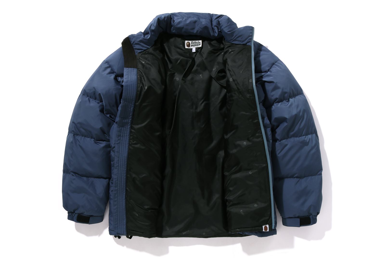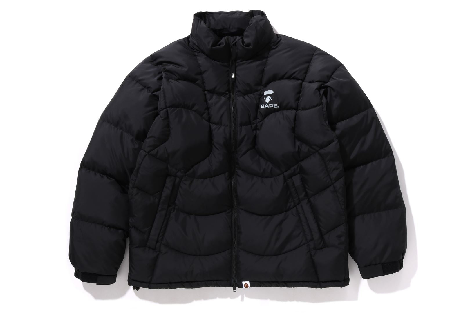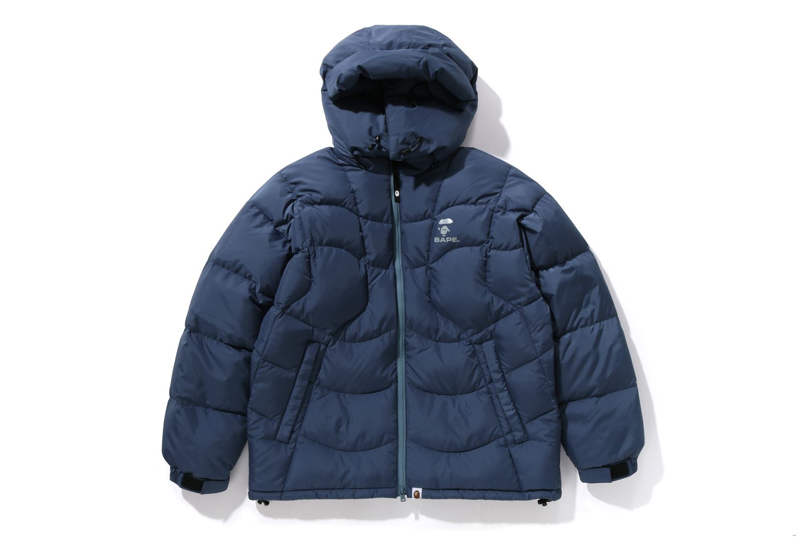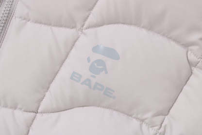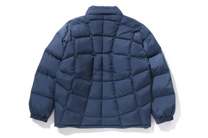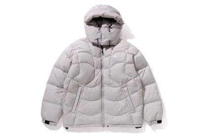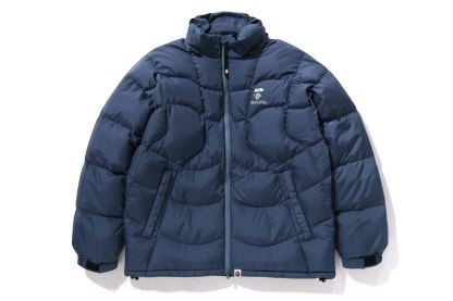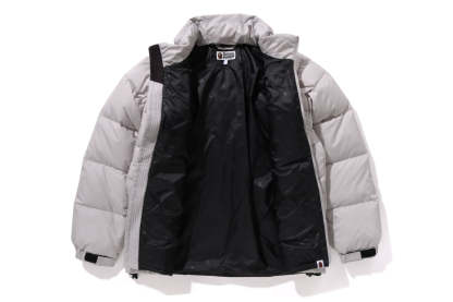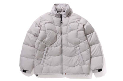 A puffer down jacket made of ripstop polyester material with distorted stitching. The padding uses KAWADA DOWN from Kawada Feather (90% down, 10% feather, 700FP) for high cold protection. Reflective print of AthtPE FACE on the left chest, and a piss name tucked in the center of the hem. Slash pocke