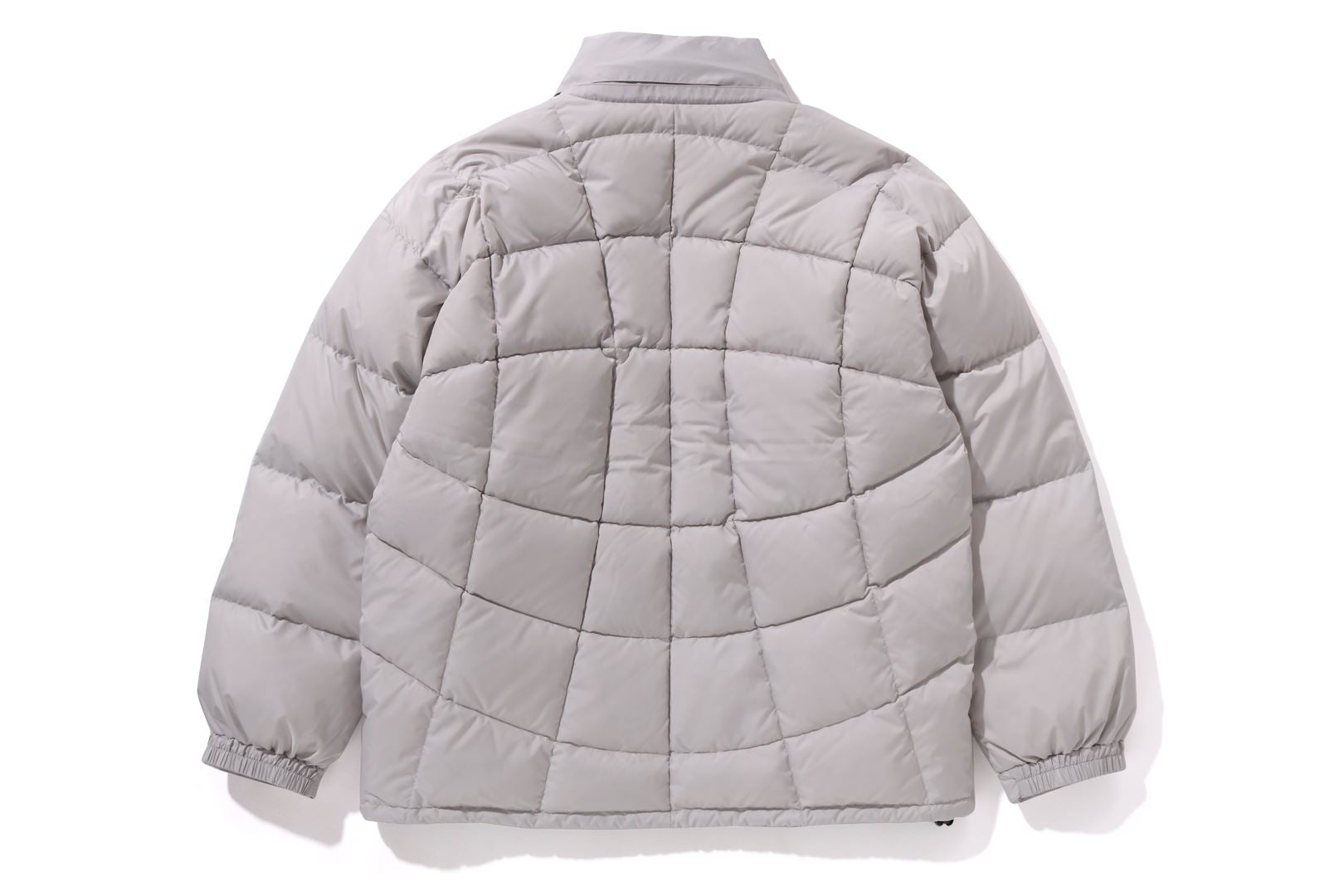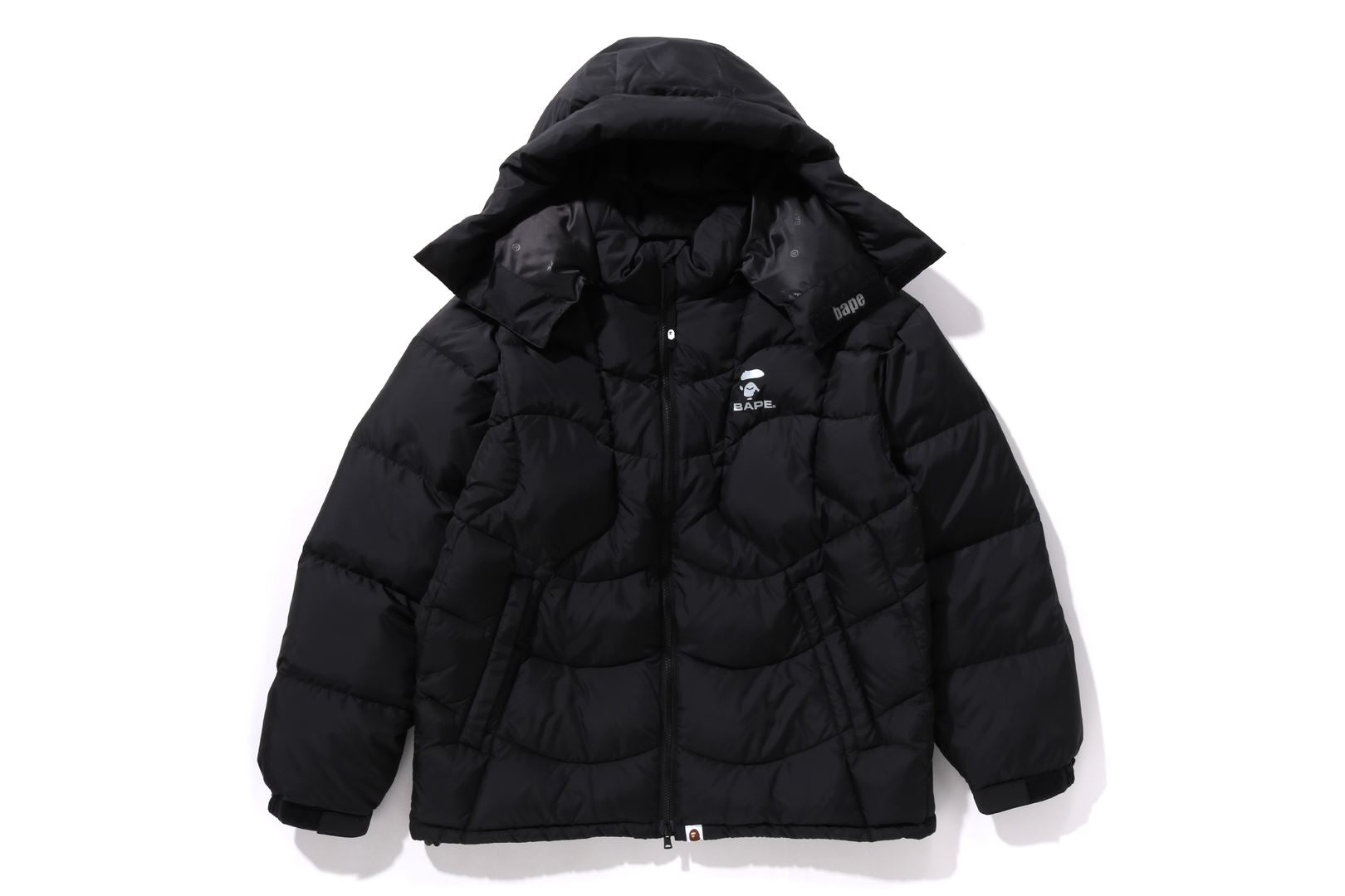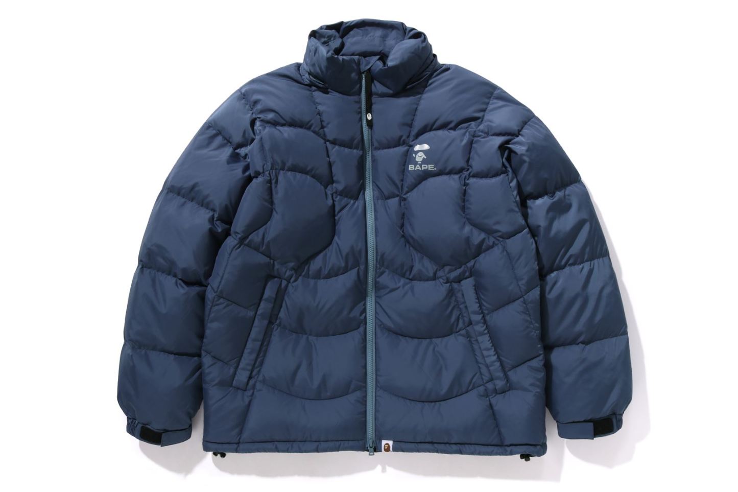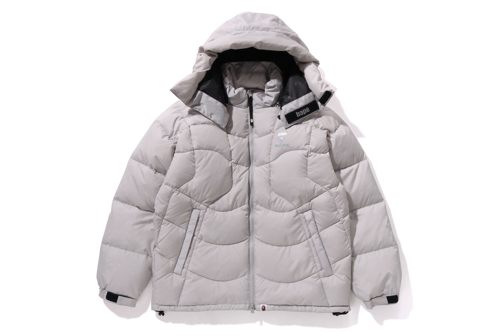 A puffer down jacket made of ripstop polyester material with distorted stitching. The padding uses KAWADA DOWN from Kawada Feather (90% down, 10% feather, 700FP) for high cold protection. Reflective print of AthtPE FACE on the left chest, and a piss name tucked in the center of the hem. Slash pocke