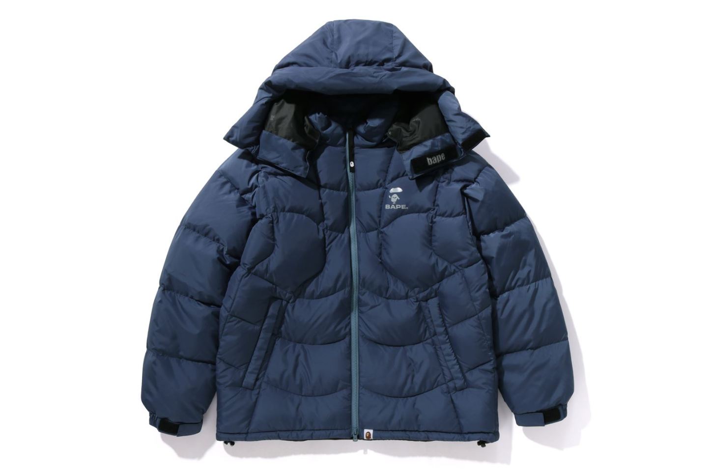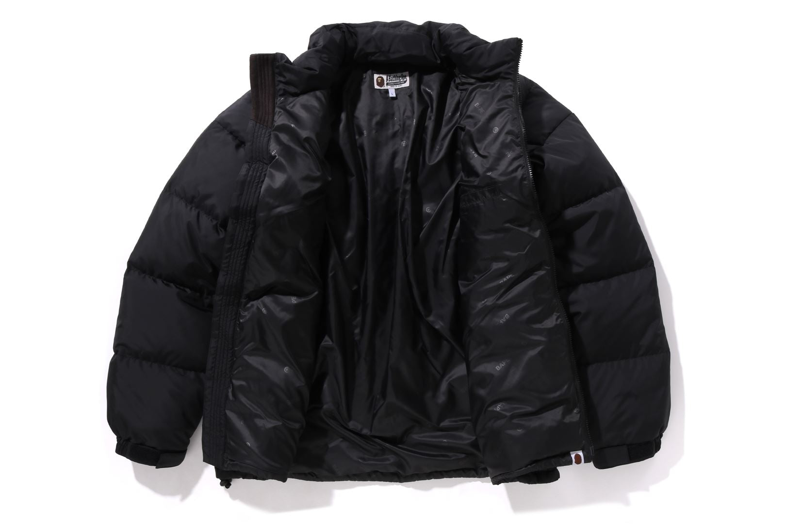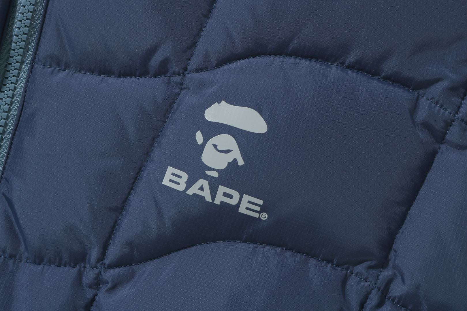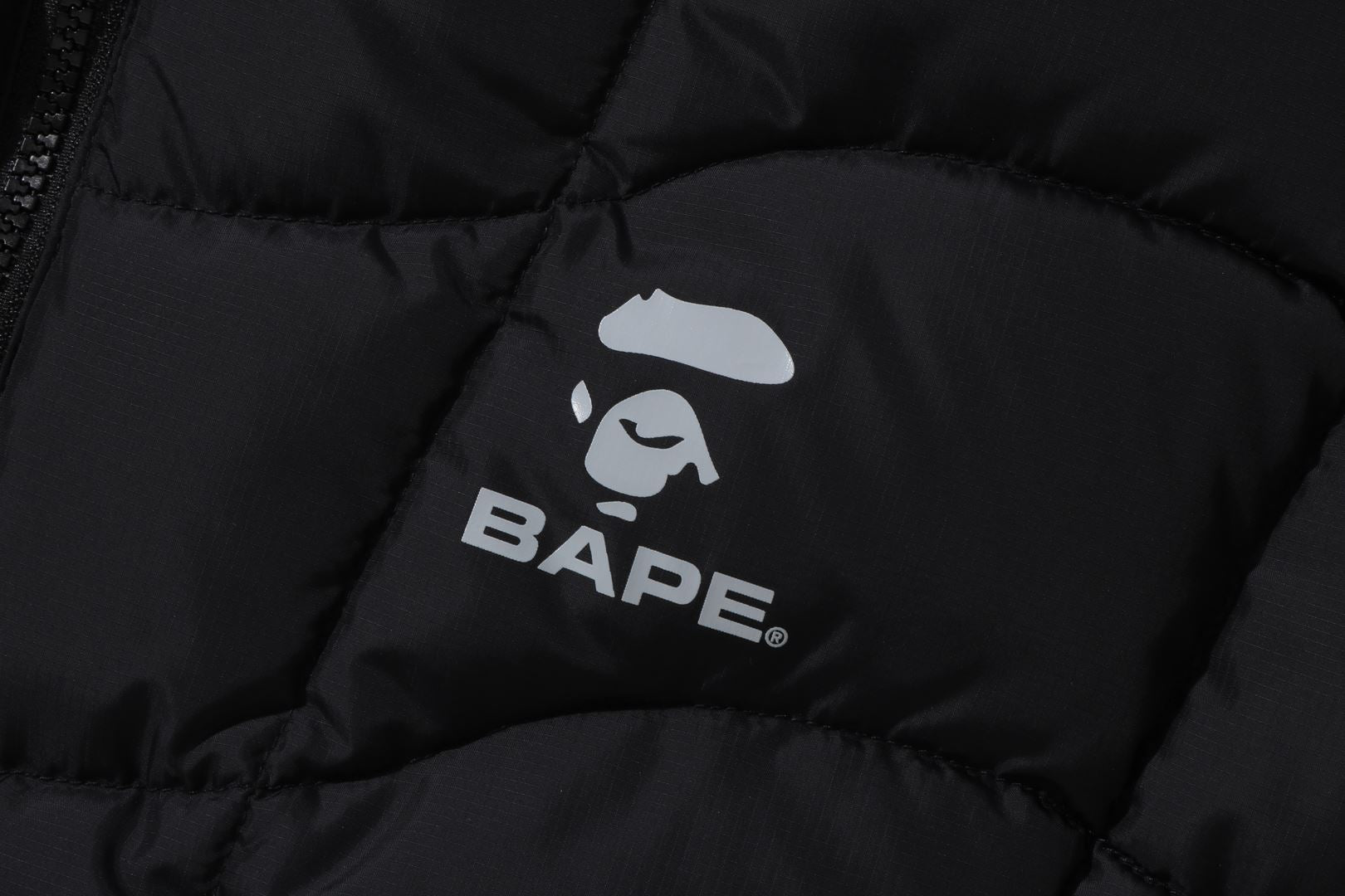A puffer down jacket made of ripstop polyester material with distorted stitching. The padding uses KAWADA DOWN from Kawada Feather (90% down, 10% feather, 700FP) for high cold protection. Reflective print of AthtPE FACE on the left chest, and a piss name tucked in the center of the hem. Slash pocke
