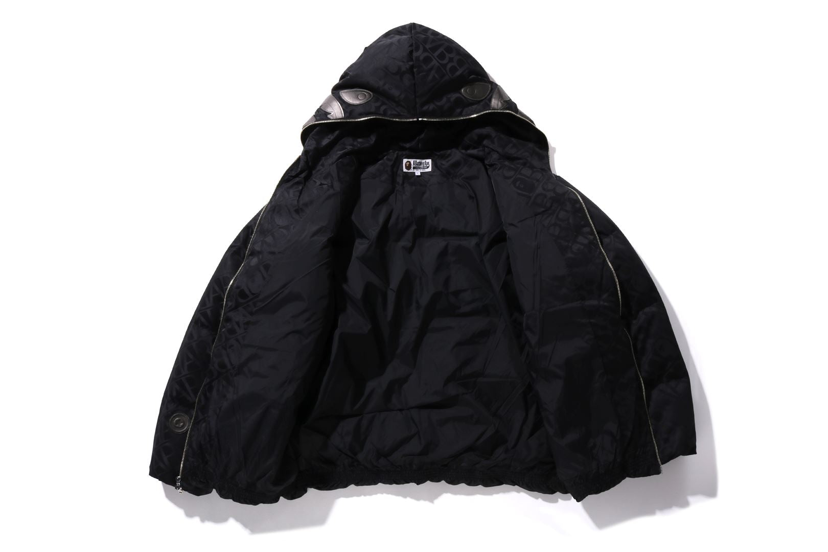 A puffer down jacket made of nylon material with an all-over monogram pattern. The padding uses KAWADA DOWN from Kawada Feather (90% down, 10% feather, 700FP) for high cold protection. The design features a shark felt patch on the front of the hood, a WGM Sagara patch on the right back of the hood, a TIGER motif rubber printed on the left, and a star circle motif directly embroidered on the right sleeve. The front zipper has a shark hoodie style design that opens and closes to the top of the hood. A rectangle name tag is affixed to the center hem of the body. Designed with slash pockets on both hips and spindles on both hems. A silhouette with a relaxed fit. Available in 4 colors and 5 sizes.