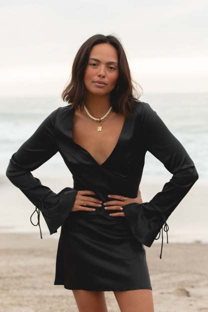 Experience the luxurious feel of our Be Mine Woven Satin Mini Dress. Made from silky smooth fabric, this babydoll dress features a flattering v-neck detail and stylish wide sleeve pop.
