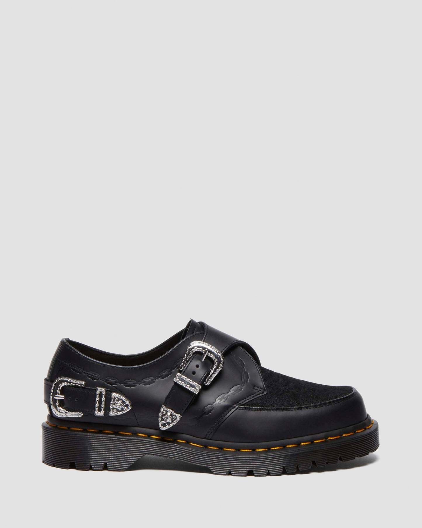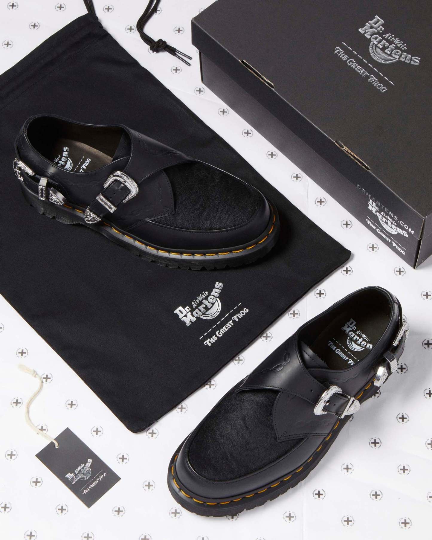 Our second collaboration with London jeweller The Great Frog includes this reworked version of our Ramsey creeper. It is made from black Smooth leather with a Hair-on vamp, with hardware engraved by TGF Creative Director Reino Lehtonen-Riley. The leather is detailed with debossed chain artwork, which also forms the border of the vintage-inspired silver buckles on the shoe��s heel and Monk strap fastening. The rugged BEN sole is punched with our yellow welt stitching, and the sock is printed with the DM��s x TGF logo.
